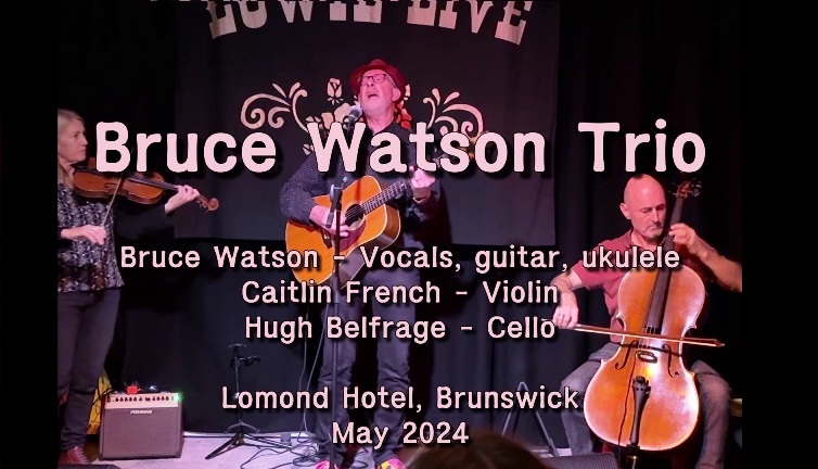 View Showreel - Bruce Watson live!Bruce Watson is captivating In live performance. Powerful songs, funny songs, and a genuine and joyous relationship with audiences. Whether solo, or with others, he is always an audience favourite. Click here or on the image to watch. Bruce Watson Trio - Live!Bruce Watson joins with Caitlin French and her scintillating violin and Hugh Belfrage with his exquisite cello as the Bruce Watson Trio. The trio has all the joy and power of Bruce's solo performances, added to rich, lush and rollocking accompaniments. Click here or on the image to watch. Download photos